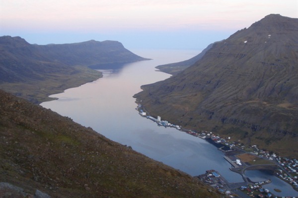 From Fjardarheidi heath on road 93, a 5km dirt road, passable in summer to normal cars under normal conditions, takes you to the panoramic mountain viewpoint over the avalanche barriers, the town, and fjord.