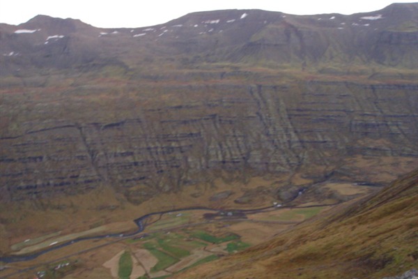 Mt. Bjolfur is an impressive 1085m peak overlooking Seydisfjorður. The steep sides of the mountain are an avalanche hazard and barriers have been constructed on the mountain flank to prevent avalanches from falling on the town.