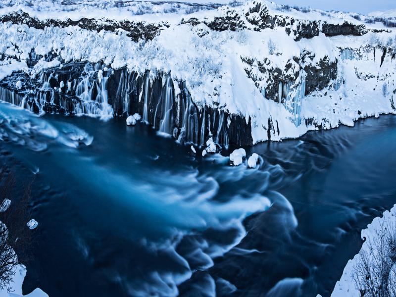 Possibly Iceland’s most unusual and enchanting waterfall, Hraunfossar ‘Lava Falls’ emerges from under a lava flow, cascading into the turquoise river Hvita.