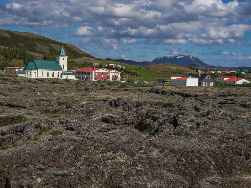 At Reykjahlid, there are two hotels, a Visitor Centre, cafe, supermarket, and craft shops. During the 1724-9 eruptions, lava almost engulfed the church standing on the same site as the present modern one. Numerous walking trails start from the village – pick up a map at the Visitor Centre.