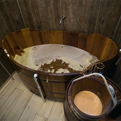 When taking a beer bath, you bathe in a big tub filled with beer, water, hops and yeast.