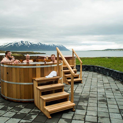 There is a big outside area with a great view over Hrísey island, mountains and Þorvalds valley. We have two outside hot tubs that take 8-10 people each.