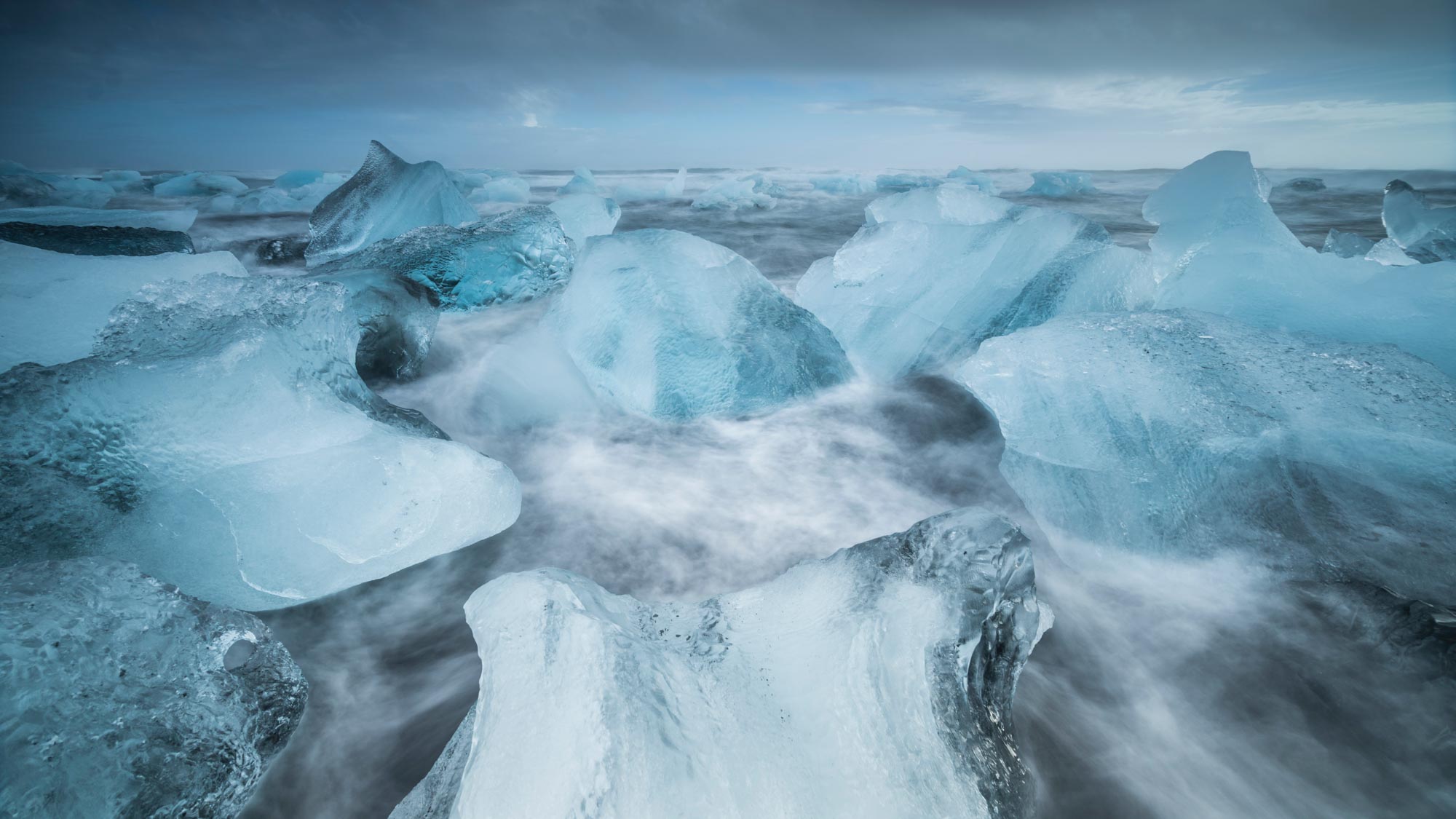 Receding ice has led to the formation of glacial lagoons in many places. In some of these lagoons, icebergs calved from the glacier front float, up-end and turn over as they gradually break up and eventually many will drift out to sea.